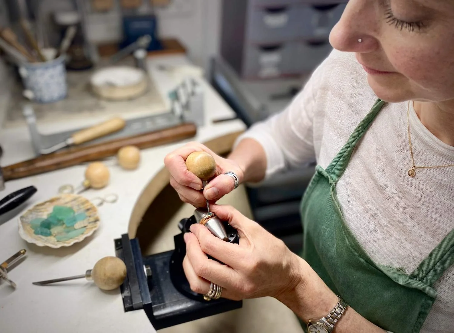 Having studied metalwork & design at University and worked as a journey(wo)man blacksmith, and with an enduring fascination with jewellery, I finally decided to do what I love full time when my family was very young. Using traditional silversmithing techniques and simple hand tools, I began designing and making recycled silver and gold wedding jewellery, first for friends and then for customers worldwide. It soon got busy!