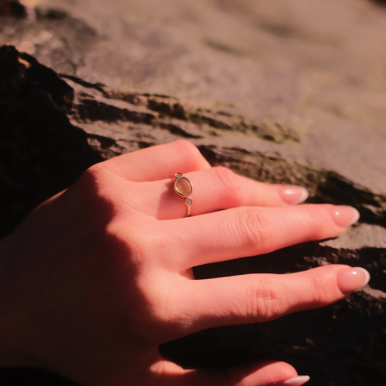 The colour balances beautifully with the 14ct yellow gold, which has a slightly more subtle colour than 9 or 18ct golds, and itβs all set off with two sparkling recycled white diamonds either side of the sea glass, and a lighlty organic hammered band.